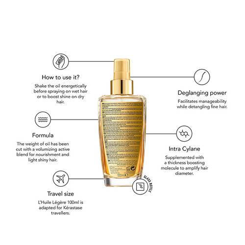 The sublimating Bi-phase oil mist ideal for finer hair types is boosted with Intra-Cylane® to provide thickness, body and shine to dull hair. A nourishing formula with Marula Oil, Camellia Oil, and Corn Germ Oil, delivers active nutrients that deeply penetrate the fiber for long-lasting results. Through a gentle perfumed application, fine to normal hair seeking shine is deeply treated, and frizz visibly appears controlled for up to 96 hours, even in 80% humidity. Hair is endowed with an alluring fragrant halo and shine.